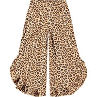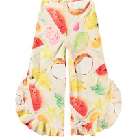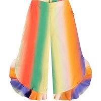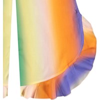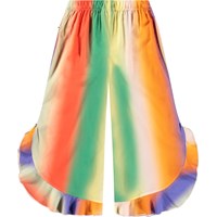 Luftiga byxor med volangkant tillverkade av ekologisk bomull. Byxorna har en lös passform, en sidodragkedja och resår i ryggen, vilket gör dem bekväma att bära. De har ett regnbågsmönster över hela.