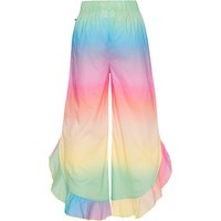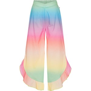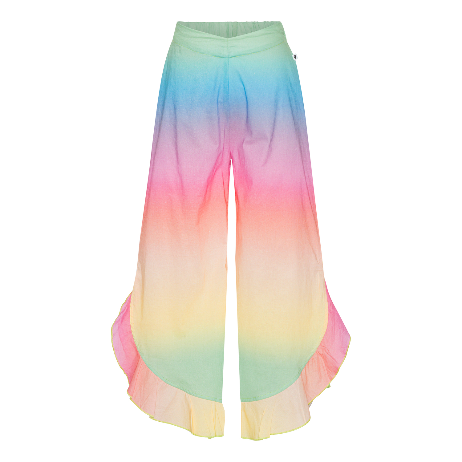 Långa luftiga byxor med ett multifägat mönster i en lätt 100% ekologisk bomull. Mönstret består av regnbågens alla färger som går över i varandra. Byxornas midja har gummiband baktill, benen har en böjd kant med volanger och slitsar i sidorna, som tillsammans gör dem enkla att hoppa i och ha utanpå badkläderna. Denna style har en oversized passform. Önskar man en mer normalpassform, rekomenderar viatt man väljer en storlek mindre än man brukar. Detta gäller också om barnet är mellan två storlekar.