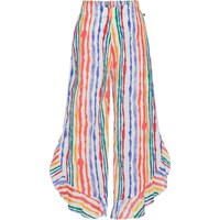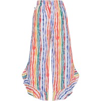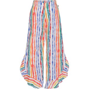 Långa luftiga byxor med ett multifägat mönster i en lätt 100% ekologisk bomull. Mönstret består av färgstrålande akvarellmålade ränder. Byxornas midja har gummiband baktill, benen har en böjd kant med volanger och slitsar i sidorna, som tillsammans gör dem enkla att hoppa i och ha utanpå badkläderna. Denna style har en oversized passform. Önskar man en mer normalpassform, rekomenderar viatt man väljer en storlek mindre än man brukar. Detta gäller också om barnet är mellan två storlekar.