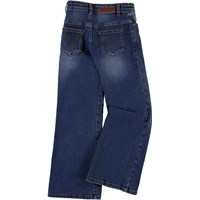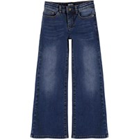 Asta är ett par blå breda jeans med vidd i benen. Notera att storlekarna upp till 134 har yryckknapp och inte vanlig jeansknapp.
