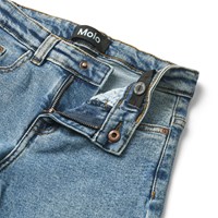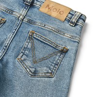 Ljusblå jeans i ekologisk bomull med stretch, 5 fickor, vida ben och en normal passform. Midjan kan justeras med ett invändigt justerbart gummiband, vilket säkrar en perfekt passform för alla barn. Storlekarna 92-134 har tryckknappar, vilket gör det enkelt att ta av och på byxorna, medan storlekarna 140-176 har en vanlig jeansknapp.