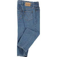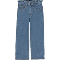 Blå croppade och högmidjade jeans med volangdetalj. Dessa jeans är tillvekade i bomull med 1% elastan, vilket säkrar en skön passform. De har fickor i sidorna, bakfickor, volangdetalj i midjan och en normal och croppad passform. De kan justeras med invändigt gummiband så att de passar perfekt till alla barn. Storlek 92-134 har tryckknapp så de är enkla att ta av och på - storlek 140-176 har vanlig jeansknapp.