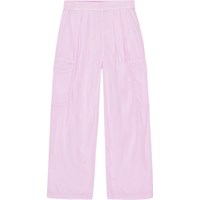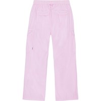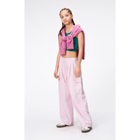 Rosa byxor med två påsydda fickor på varje lår. Byxornas midja är fast framtill med gummiband baktill, viket ger en bra passform och gör dem enkla att ta av och på. Byxorna har breda veck framtill och ger byxorna vidd och en baggy look.