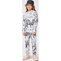 Aura är ett par grå sweatpants med hästar som är ton i ton med byxorna. Byxorna har gummiband i midjan och knytband.