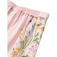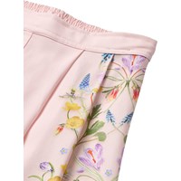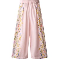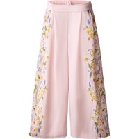 Rosa vida byxor i mjuk viskos med fina blommiga detaljer längs utsidan av låren. Byxorna har ett fast midjeband framtill och resår baktill, vilket gör dem både bekväma att bära och lätta att ta på och av. Ett veck framtill ger byxorna ett lätt och luftigt utseende.