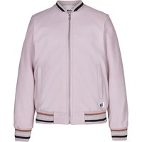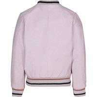 Rosa läderjacka i det mjukaste lammskinn med dragkedja, fickor i sidan och randig ribb i hals, ärmslut och nederkant.