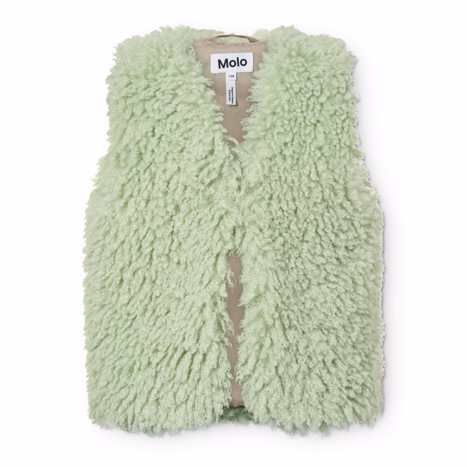 Ljusgrön fluffig väst i teddymaterial av återvunnen polyester. Västen stängs med en liten hake som fulländar den mjuka och mysiga looken.