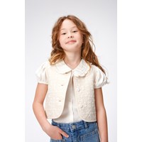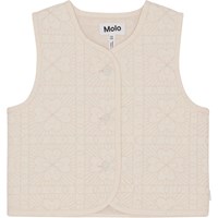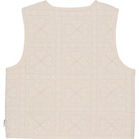 Sandfärgad fodrad väst i quiltad bomull. Västen har rund hals, knappar framtill, kantband vid ärmöppningar och hela vägen runt i kanten, vilket ger en fin finish. Västens quiltade mönster föreställer kvadrater med fina klöver i.