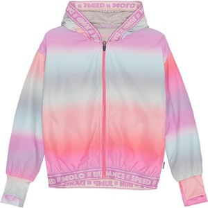 Ophelia är en luftig sportjacka med pastellfärgat regnbågsmönster. Jackan har dragkedja och luva, samt rosa kantband med text. Jackan är en del av Molo´s sportkollektion, som är med och binder samman mode och sport. Kombinera Ophelia med en av de matchande plaggen för en komplett sportig look. Molo´s sportkollektion är framtagen med en unik high-performance teknologi som heter HeiQ Smart Temp, som understöttar kroppens naturliga kylfunktion. Kylfunktionen aktiveras när du är varm och svettig och deaktiveras när kroppen är nedkyld. HeiQ Smart Temp säkrar optimal komfort och prestanda. Testat oberoende som säkerhet för huden.