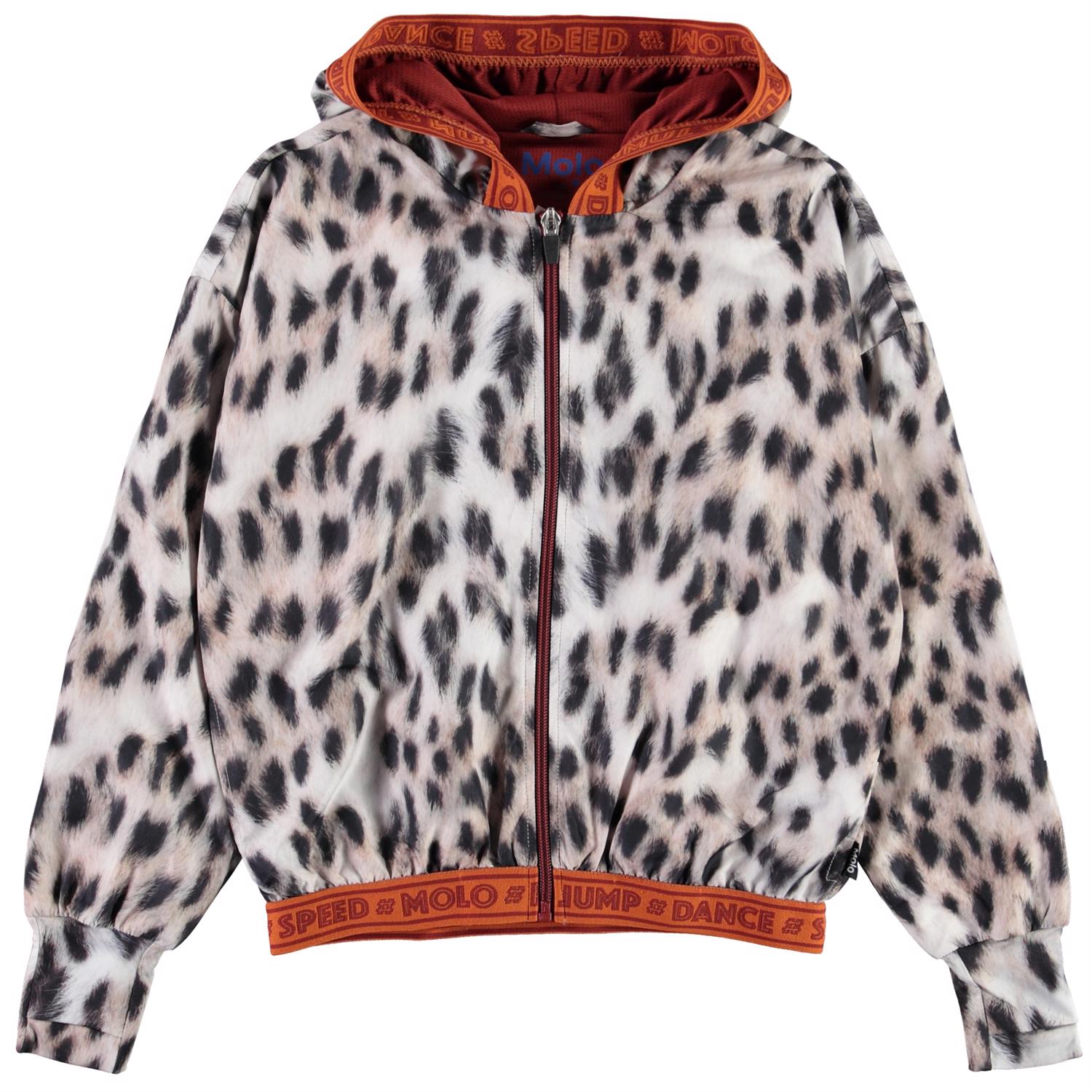 Ophelia är en luftig sportjacka med leopardmönster. Jackan har en dragkedja framtill, en luva, samt bruna kantband med text. Jackan är en del av Molos sportkollektion som sammanför mode och sport. Kombinera Ophelia med Molos matchande sportplagg för en komplett och cool look. Molos sportkollektion är framställd med en unik High-performance teknologi, kallad HeiQ smart temp, som stöder kroppens naturliga nedkylning. Kylfunktionen aktiveras när du är varm och svettig. Kylfunktionen inaktiveras när kroppen har svalnat. HeiQ Smart Temp garanterar optimal komfort och prestanda. Testat självständigt som säkerhet för huden.