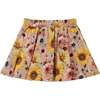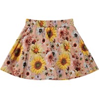 Rosa kjol med blommigt mönster. Här ses massor av olika blommorsom t.ex. solrosor och dahlior i rosa och gula nyanser. Denna kjol är tillverkad i 100% bomull, har rundad kant och brett gummiband i midjan, så den är skön att ha på. Kjolens längd är kort och den har en normal passform.