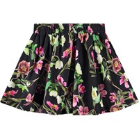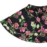 Svart kjol i ekologisk bomull med resår i midjan, vilket gör den skön och enkel att ta på. Den har en rundad skärning som faller fint till mitt på låret. Kjolen har ett mönster med julrosor i vita och ljusrosa nyanser, vackert sammanflätade med sina gröna blad.