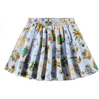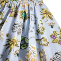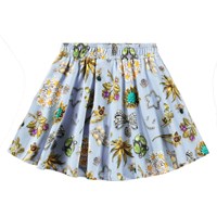 Ljusblå kjol i ekologisk bomull med ett mönster av vackra smycken. Kjolen har en elastisk midja för att göra den lätt att ta på och bekväm att bära. Den har en rundad skärning som faller fint till mitten av låret.