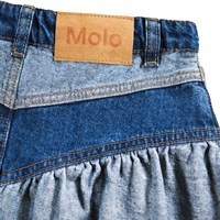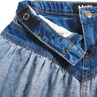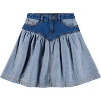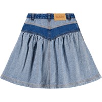 Snygg tvåfärgad jeanskjol i ekologisk bomull. Kjolen har paneler framtill och rynkor som ger den en vacker passform. Den har tre fickor, knappstängning och en justerbar midja.