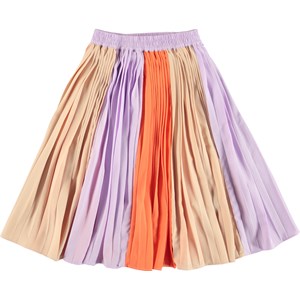 Becky är en plisserad kjol i lila, orange och beige med gummiband i midjan.