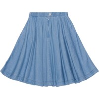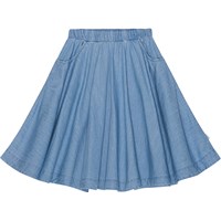 Ljusblå knälånga kjol i en mjuk bomulls chambray. Kjolen har synliga fickor, gummiband i midjan med dragkedja och knappar baktill. Kjolen är rundad och rynkas i midjan, vilket ger lite volym.