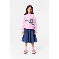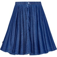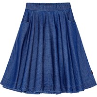 Blå jeanskjol i ekologisk bomull. Kjolen är A-linjeformad och faller snyggt strax under knät. Den har fickor i sidsömmarna, gummiband i midjan med dragkedja och knappar baktill, vilket gör den enkel att ta på och av.