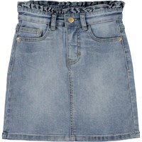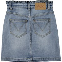 Belle är en blå jeanskjol med blå jeansvolang i midjan. Kjolen har hällor och fickor både fram och bak.