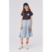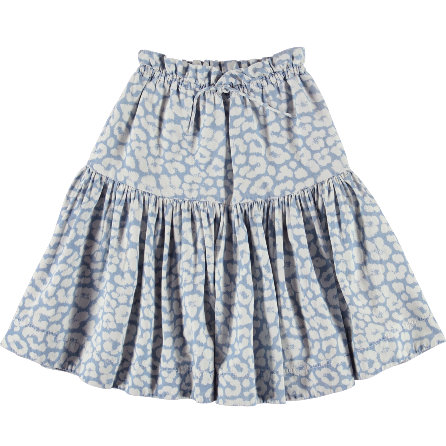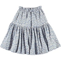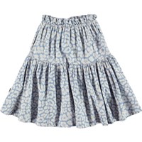 Bente är en kjol i ljusblått leopardmönster. Kjolen har en bra längd och gummiband i midjan med knytband.