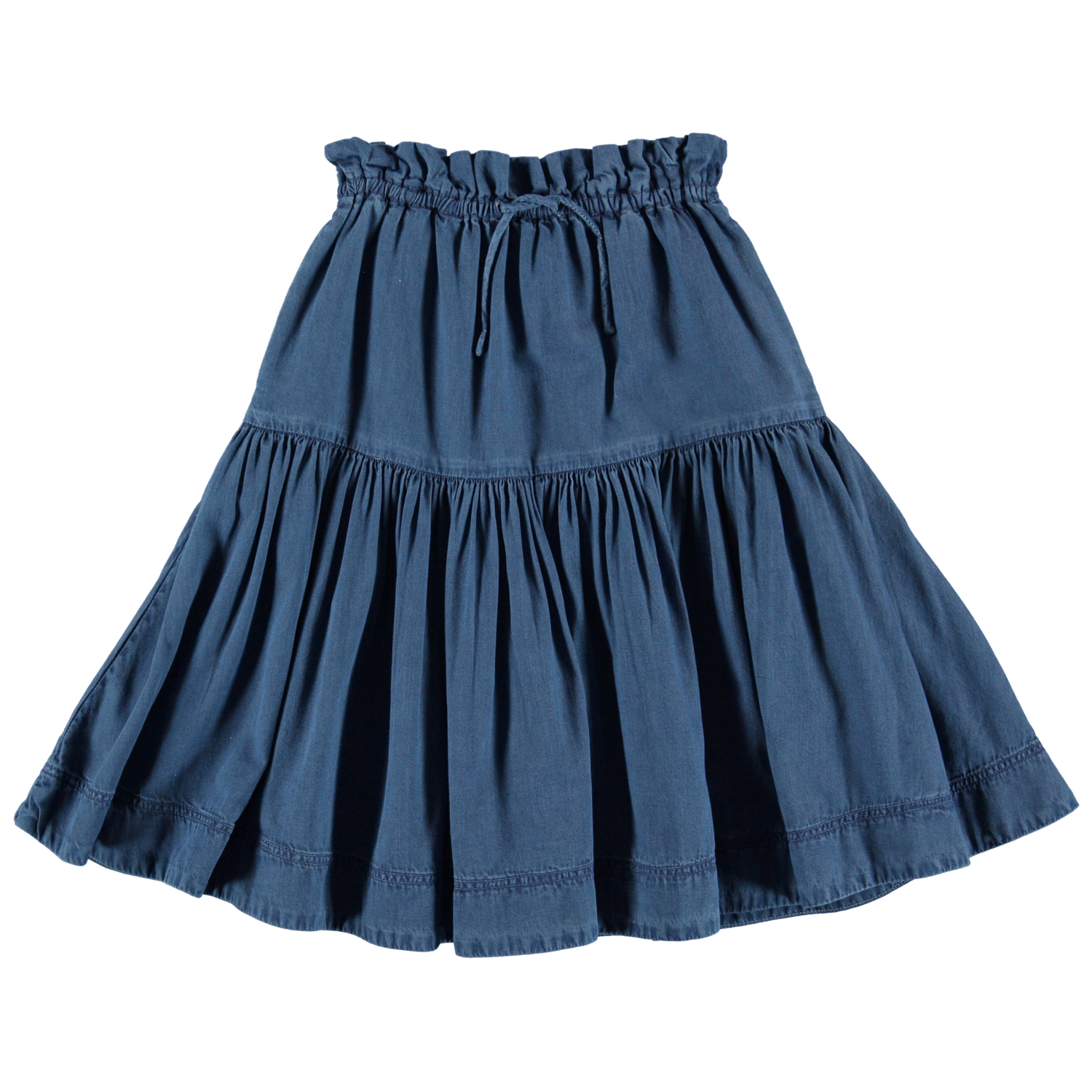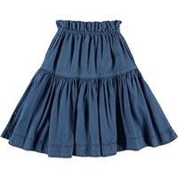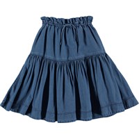 Bente är en blå kjol. Kjolen har en bra längd och gummiband i midjan med knytband.