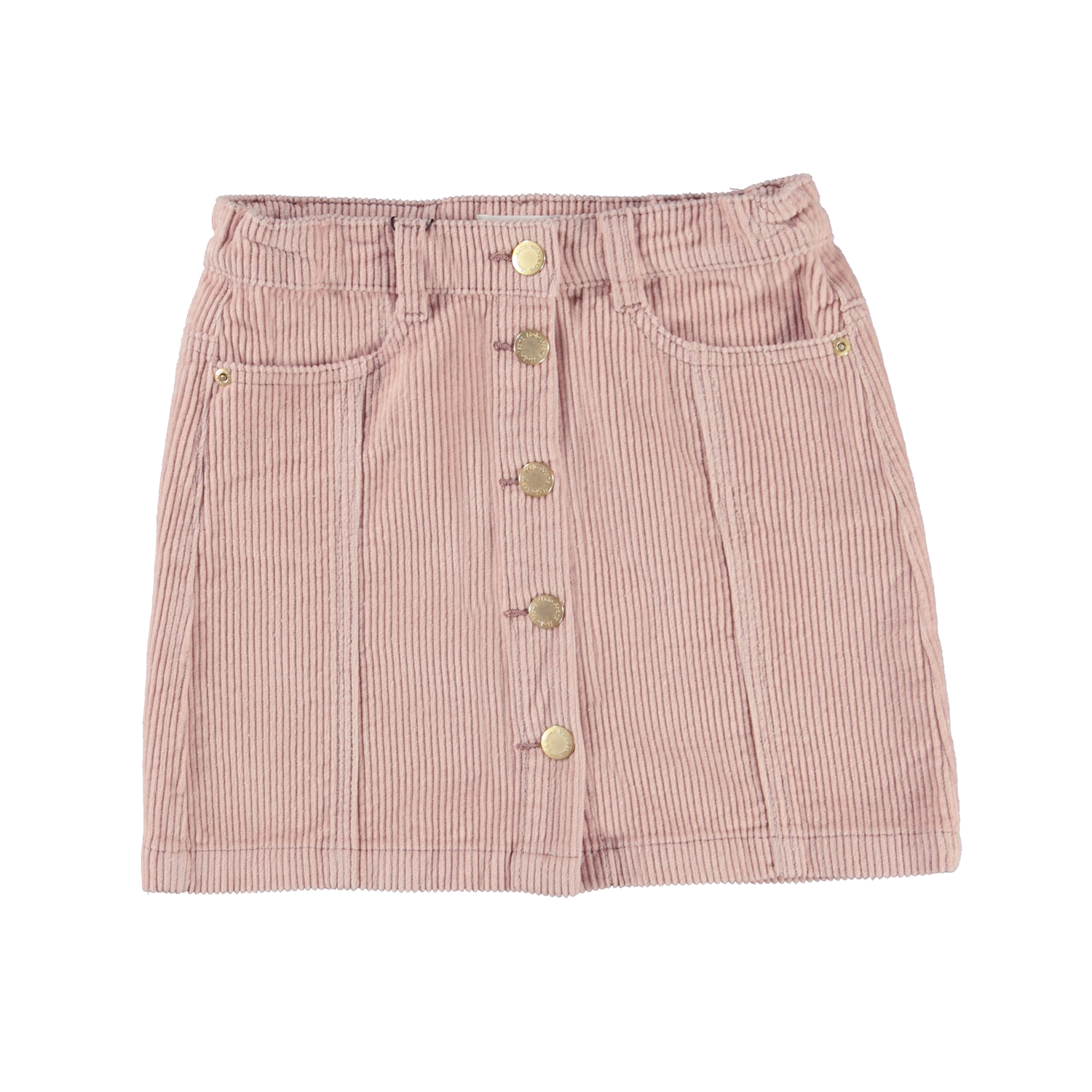 Rosa kort kjol i räfflad manchester. Denna kjol är tillverkad i 100% bomull, har fickor i sidan, guldfärgade knappar framtill, bälteshällor och normal passform. Kjolens midja kan justeras med ett invändigt gummiband så den passar perfekt till alla barn. Storlek 92-134 har tryckknapp så att kjolen är enkel att ta av och på - storlek 140-176 har vanlig jeansknapp.