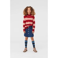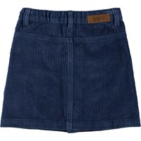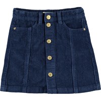 Bera är en sammetskjol i blått med en knappstängning framtill. Kjolen har hällor och fickor på framsidan.