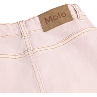 Rosa jeanskjol med guldfärgade tryckknappar upp till storlek 140 – därefter knäpps den med klassiska jeansknappar. Kjolen når till mitten av låret och har en midja med hällor, framfickor och en invändig justerbar resår, så passformen enkelt kan justeras.