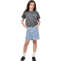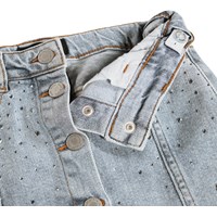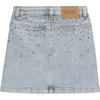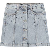 Blå denimkjol med tryckknappar upp till storlek 140 – därefter knäpps den med klassiska denimknappar. Kjolen når till mitten av låret och har en midja med hällor, framfickor och en invändig justerbar resår, så passformen enkelt kan justeras.