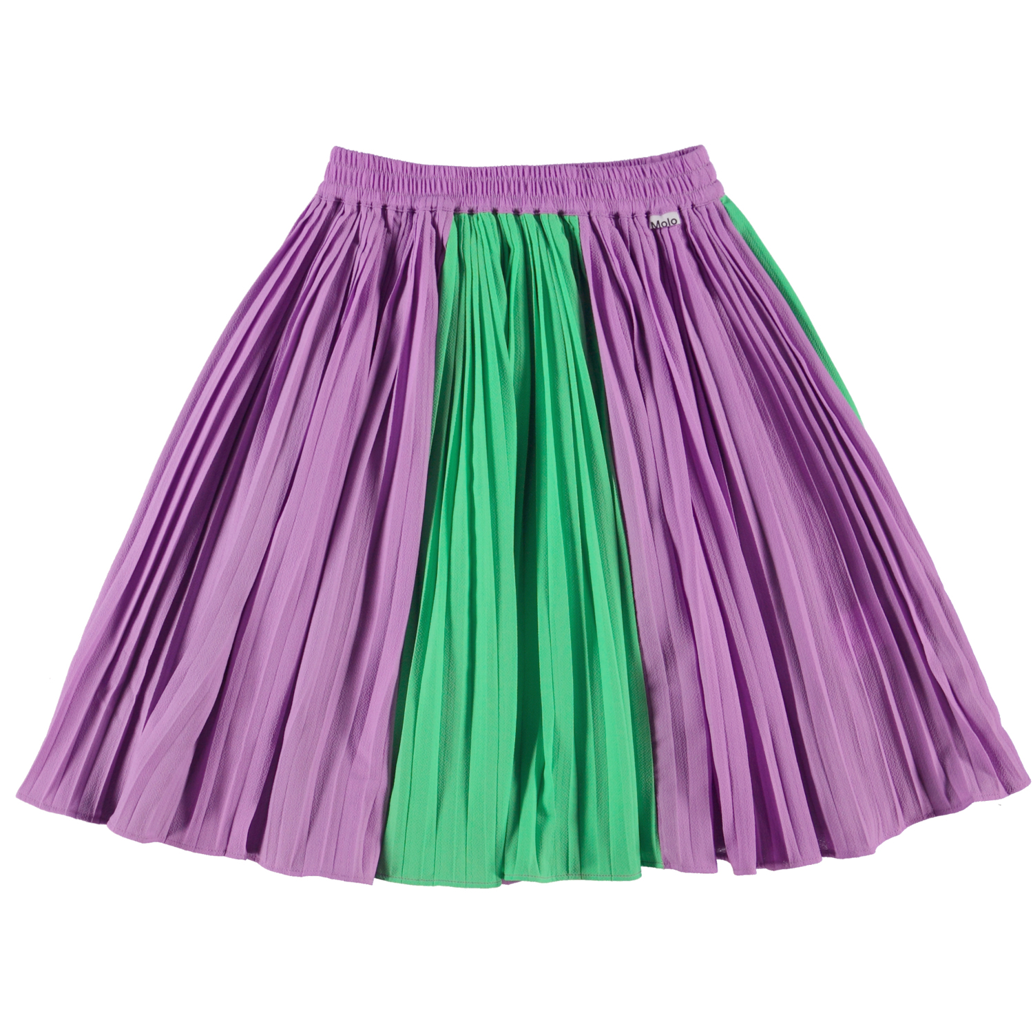 Bess är en plisserad midikjol i lila och grön, med gummiband i midjan.