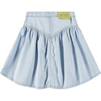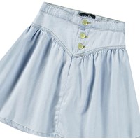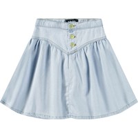 Ljusblå jeanskjol med en vacker skärning och knäppning med knappar. Kjolen har en A-linjeform och en invändig justerbar knapp i midjan för perfekt passform.