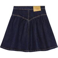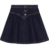 Mörkblå jeanskjol med knappar. Kjolen har en A-linjeform och en justerbar knapp inuti midjan för en perfekt passform.
