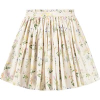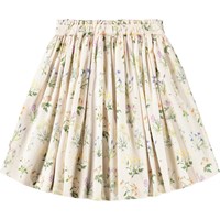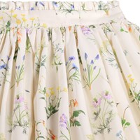 Off-white kjol i mjuk, ekologisk bomullspoplin med färgglada sommarblommor. Kjolen är knälång och har ett midjeband med en fin, liten volangkant – fast framtill och elastisk baktill – samt en osynlig dragkedja på sidan, vilket gör den lätt att ta på och bekväm att bära. Kjolen har fina rynkor från midjan, vilket ger den ett mjukt fall och livfullt utseende.