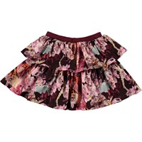 Bini är en bordeaux-färgad kjol med blommor. Kjolen har 2 lager och en resår i midjan.