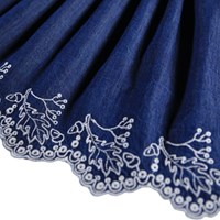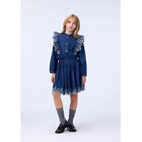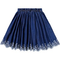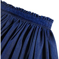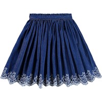 Blå kjol i ekologisk bomullschambray med vit broderie anglaise-brodyr. Kjolen är knälång med en midjeband som är fast framtill och elastiskt baktill för att göra den lätt att ta på och bekväm att bära.