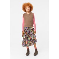 Svart veckad kjol i mjukt och lätt viskosmaterial. Kjolen faller diagonalt och mjukt över knäna, och midjan är tight med en sidodragkedja, vilket gör den enkel att ta på. Kjolen har ett flerfärgad tryck av vackra lönnlöv som smälter samman.