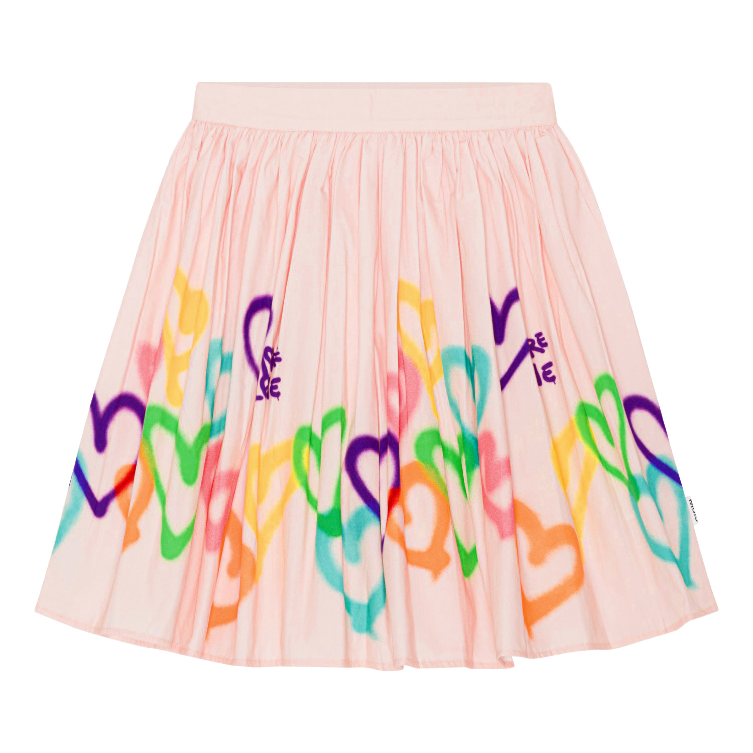 Rosa kjol i ekologisk bomullspoplin. Kjolen har en fast midja framtill medan den baktill har gummiband så den är enkel att ta på. Kjolen är rundad och rynkad i midjan. Mönstret är ett grafittimönster med hjärtan som följer kjolen runt om.