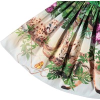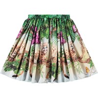Mångfärgad knälång kjol i ekologisk bomull med djungelmönster. Kjolen har en fast midja framtill med elastik baktill, vilket gör den enkel att ta på och bekväm att bära. Kjolen samlas runt midjan, vilket ger den en fin volym.