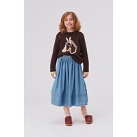 Bree är en blå jeanskjol med bra längd och fin vidd. Kjolen har gummiband i midjan.