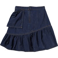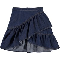 Breena är en blå jeanskjol med omlotteffekt och volangkant. Kjolen har dragkedja baktill.