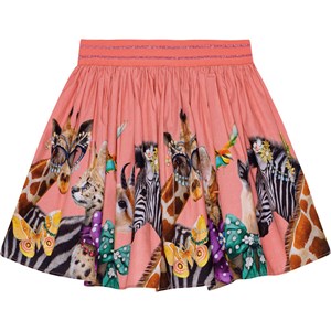 Korallfärgad kjol gjord av ekologisk bomull. Kjolen är bekväm och lätt att dra på sig med randigt gummiband i midjan. Den har et tryck av färgglada festliga djur runt omkring, prydda med glasögon, diamanter och blommor.