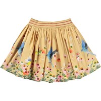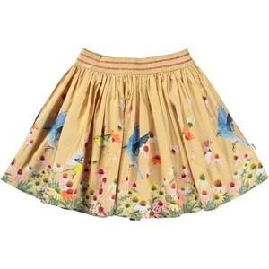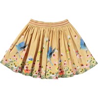 Brenda är en ljusgul kjol med blomsteräng och fåglar. Kjolen har gummiband i midjan med smala gyllene ränder.