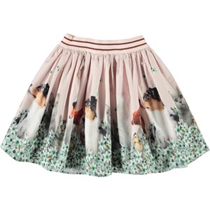 Brenda är en rosa, rundad kjol i ekologisk bomullspoplin. Brenda har gummiband i midjan med 2 vinröda glitterränder. Här är Brenda med olika arter av djurvänner myser tillsammans på enblå blomsteräng.