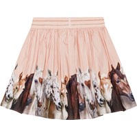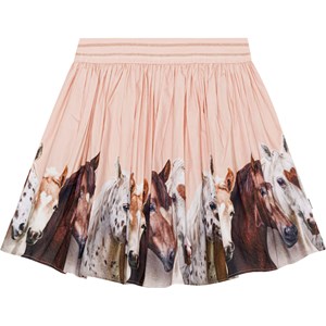 Puderfärgad, rundad kjol i ekologisk bomull. Kjolen är skön att ha på och att ta på med det glitterrandiga gummibandet i midjan. Kjolen har ett mönster med hästar i bruna och vita nyanser längs hela botten.