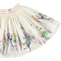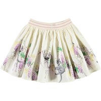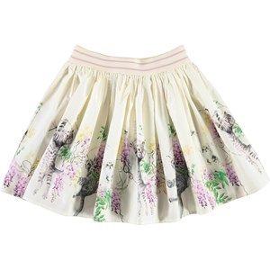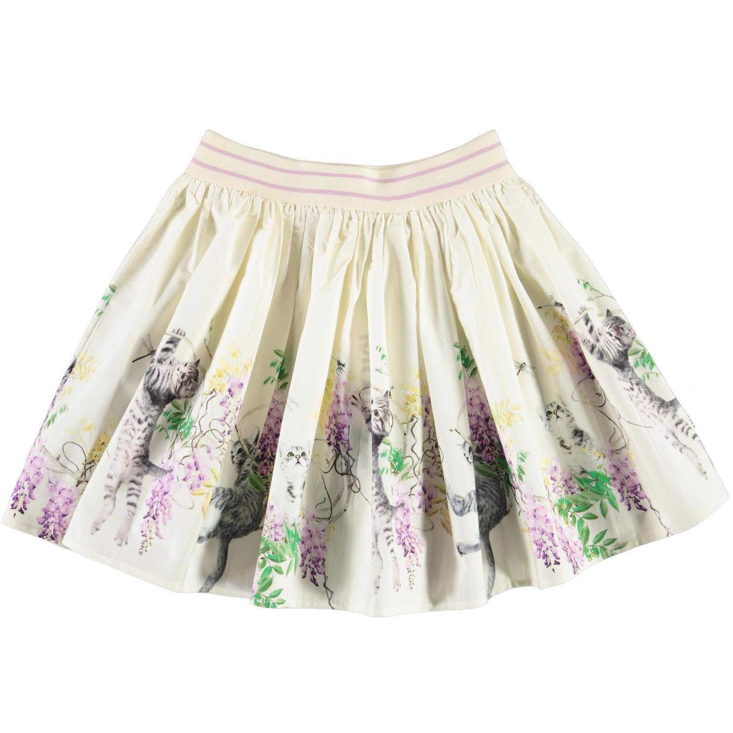 Brenda är en lätt bomullskjol med katter som leker bland lila blommor.