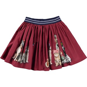Brenda är en mörkröd kjol med olika keldjur med mössor och pannband på. Kjolen har gummiband i midjan med smala ränder.