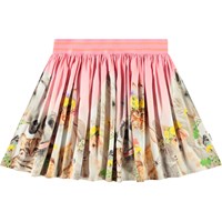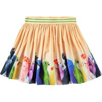 Ljusorange kjol i ekologisk bomull. Kjolen är bekväm och lätt att ta på med den elastiska midjan. Den har en rundad kjol, randigt midjeband och ett mönster av små färgglada papegojor.