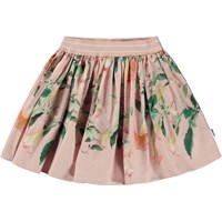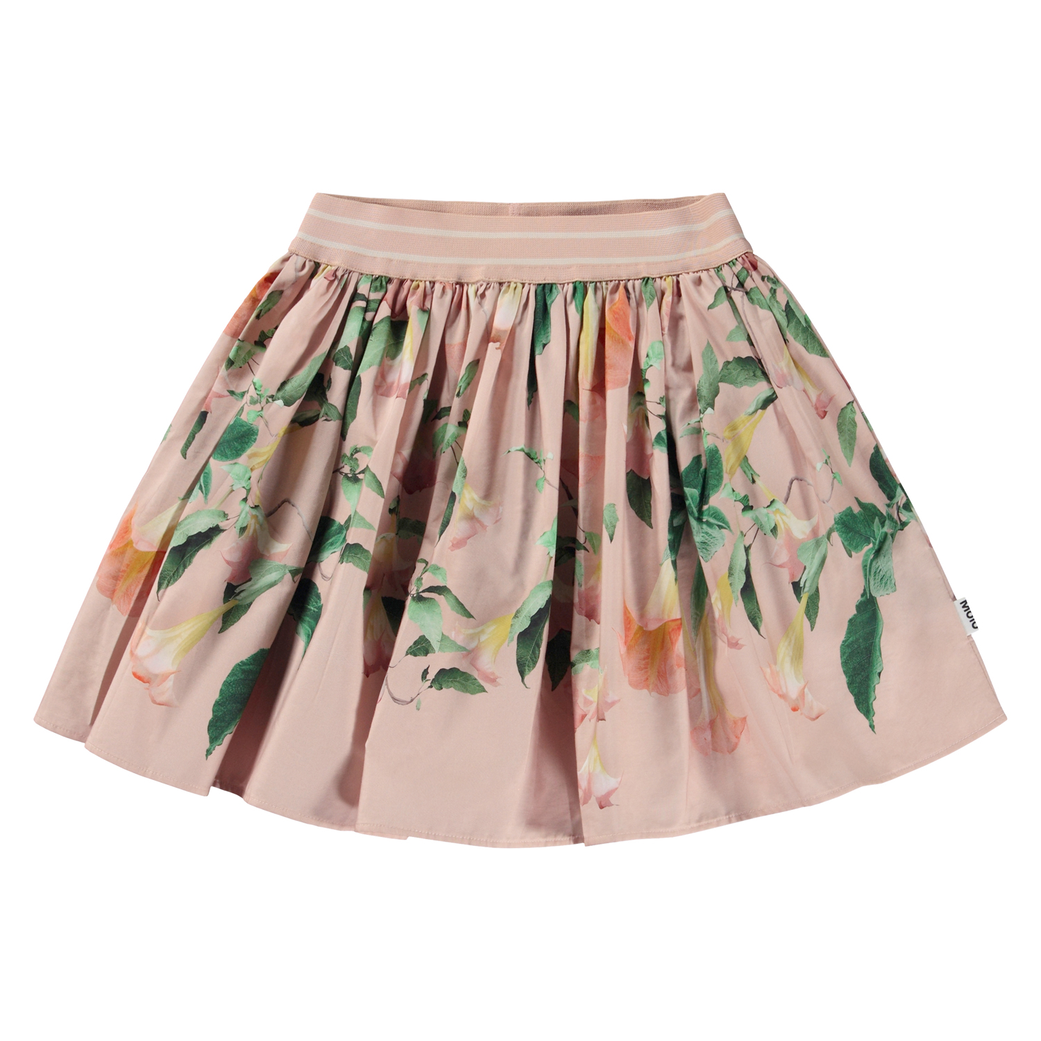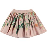 Rosa rundad minikjol med blommigt mönster och massor av volym. Mönstret har en svagt rosa bakgrund och är sammansatt av rosa höstblad och nattblommande änglatrumpeter. Speciellt för änglatrumpeten är att den inte blommar på dagen, som andra blommor, utan bara på natten. Här badar de i månens sken och viker ut sina blad, allt detta medan vi andra sover. Denna kjol är tillverkad i 100% bomullspoplin, har brett gumiband i midjan och en normal passform.