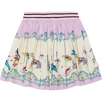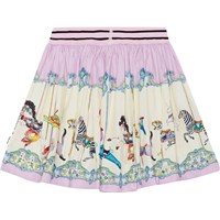 Lila och råvit rundad kjol i ekologisk bomull. Kjolen är skön att ha på och att ta på med det glitterrandiga gummibandet i midjan. Kjolen har ett mönster med multifärgade karuseller längs hela botten.