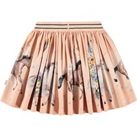 Rosa cirkulärskuren kjol i ekologisk bomull. Kjolen är bekväm och lätt att ta på med den elastiska randiga midjan. Kjolen har ett mönster av hästar och blommor.