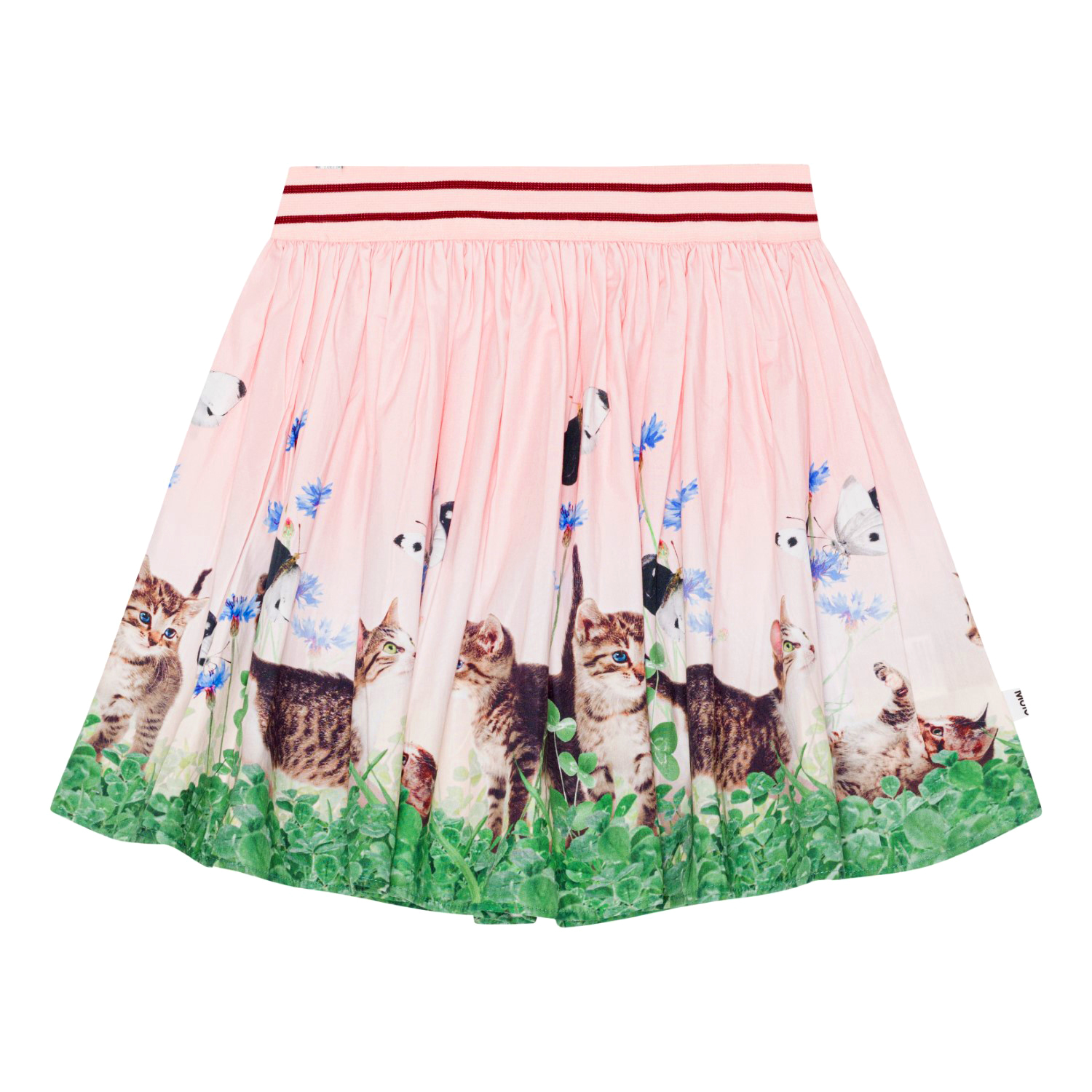 Rosa, rundad kjol med draperat fall i lätt poplin med leksugna kattungar. Kjolen är tillverkad i ekologisk bomull och har gummiband i midjan så att den är skön att ha på.
